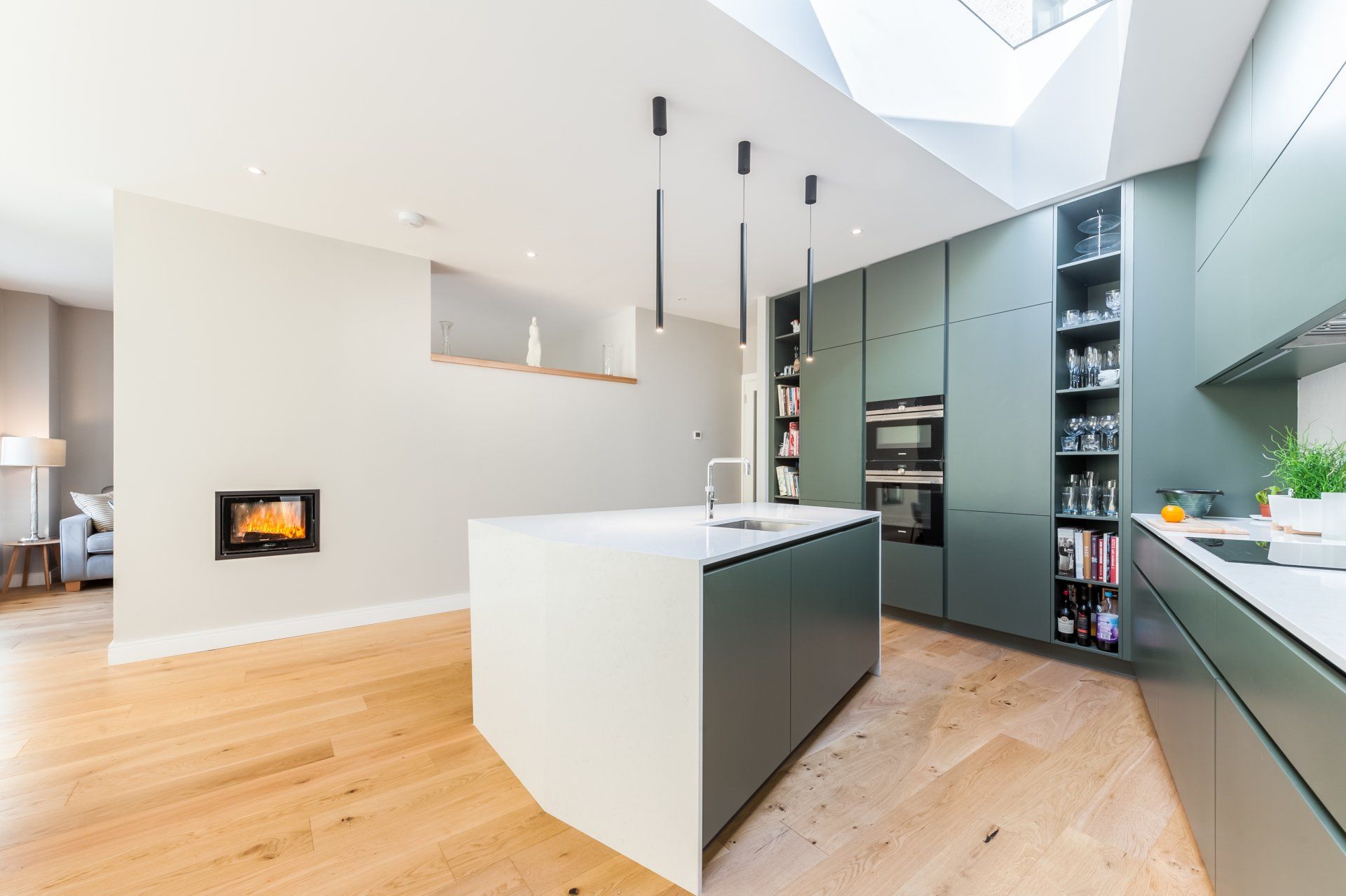 The extension features super bright velux windows, a beautiful open space with superb views through the sliding glass doors. Throughout we have used best materials with designer presses, an island in the kitchen, and ultra cool lighting.
